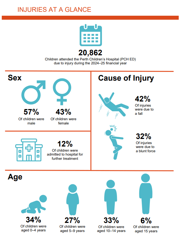 The Kidsafe WA Childhood Injury Bulletin Annual Report: 2024-2025 provides an overview of all children who reported with an injury to the emergency department (ED) of Perth Children’s Hospital (PCH) between July 2024 and June 2025.