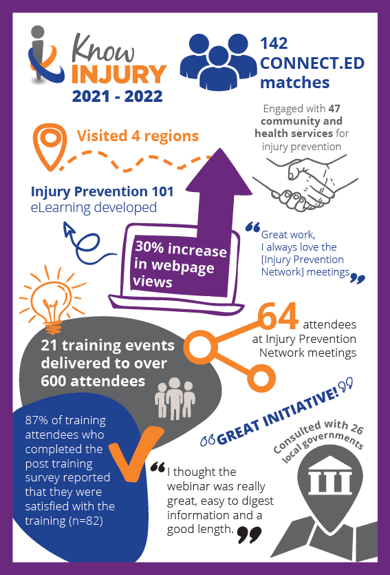 During the 2021/2022 financial year Injury Matters continued to grow the capacity of the WA injury prevention sector through the Know Injury program. With funding from the WA Department of Health, a variety of Know Injury activities were provided over the last twelve months, a number of which are highlighted below.