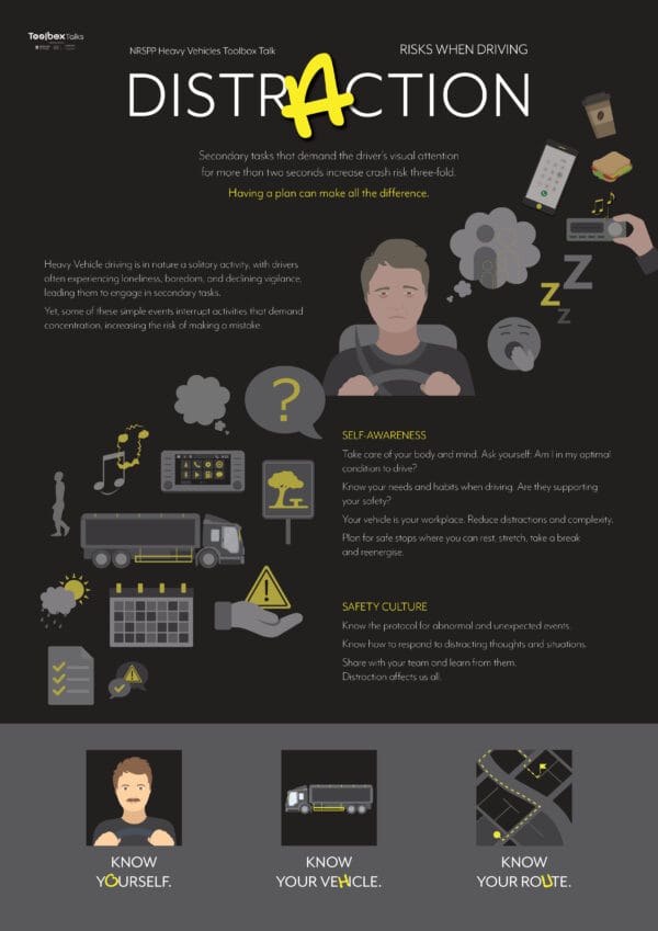 The NRSPP’s latest Toolbox provides a comprehensive package for workplaces to communicate information and knowledge about driver distraction to their heavy vehicle workforce. Download the resources today.