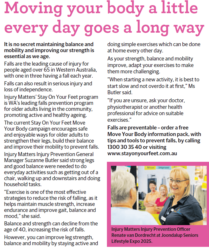 Throughout September to November 2025, Injury Matters proudly delivered the Stay On Your Feet® program Move Your Body campaign. Move Your Body raises awareness among older Western Australians on how to prevent falls through improving balance, mobility, and strength.