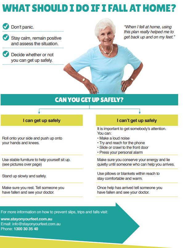 The Stay On Your Feet® get up off the floor flyer can step you through how to get up safely using your knees or your arms.