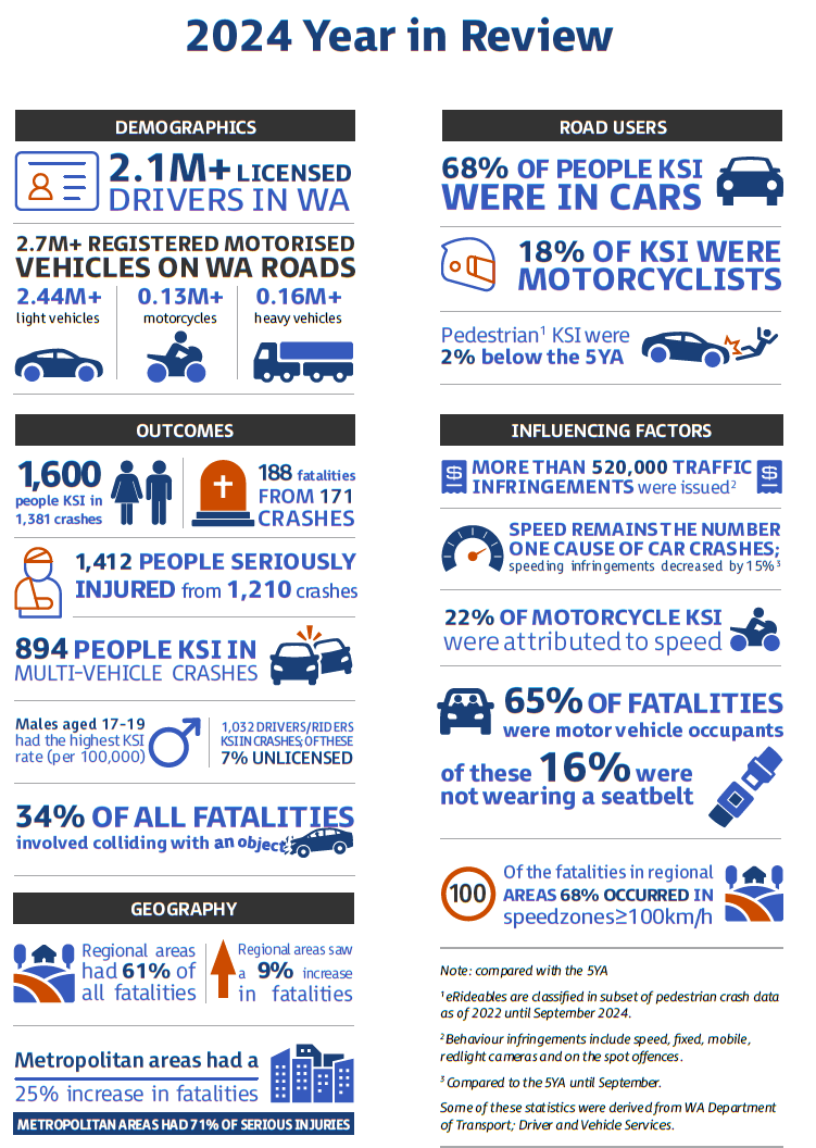 In 2024, 1,600 people were killed or seriously injured in 1,381 road crashes on WA roads, including 188 fatalities and 1,412 serious injuries. It was reported that;