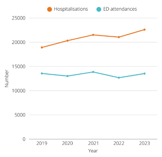 Number of falls hospitalisations and ED attendances in WA, 2019 – 2023.